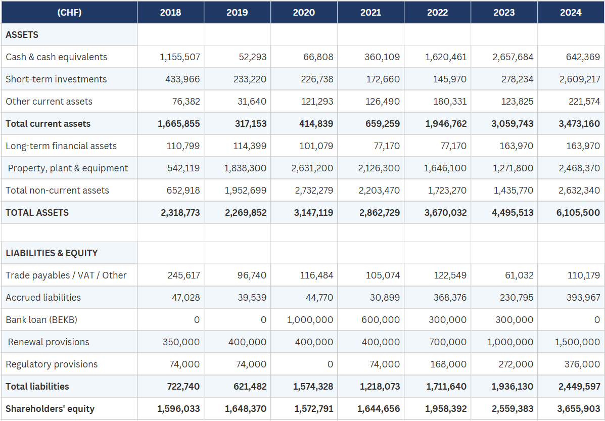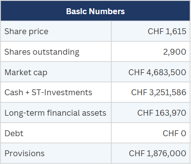 The balance sheet is clean, with no debt, and CHF 3.3 million in cash and investments against a CHF 4.7 million market cap. Provisions that look like liabilities but function more like retained earnings.