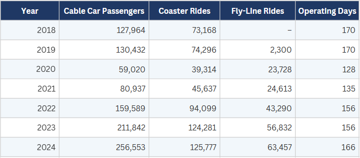 Cable car passengers have doubled since the pre-COVID peak. Coaster rides are up 69%. The fly-line has grown from nothing to over 63,000 rides per year.
