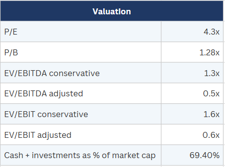 So the stock trades at a 4.3x P/E, and an EV/EBIT between 0.6x and 1.6x, with 69% of the market cap covered by cash and investments.