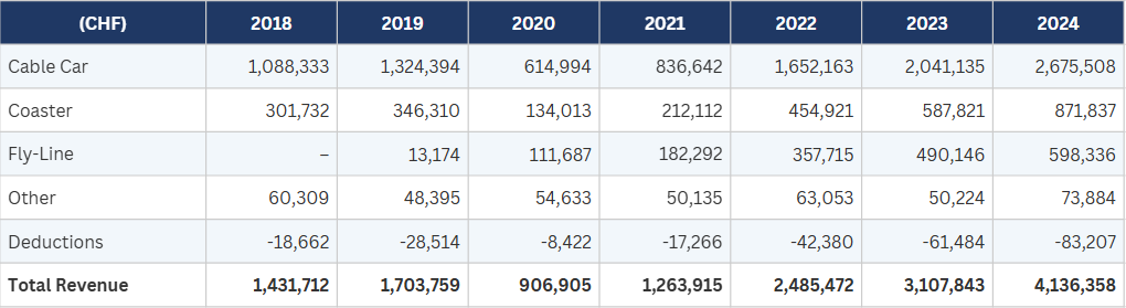 In 2018, the cable car accounted for 76% of total revenue. By 2024 that share had fallen to 65%, with the coaster and fly-line together making up 36%. That diversification makes the business more resilient to any single disruption.