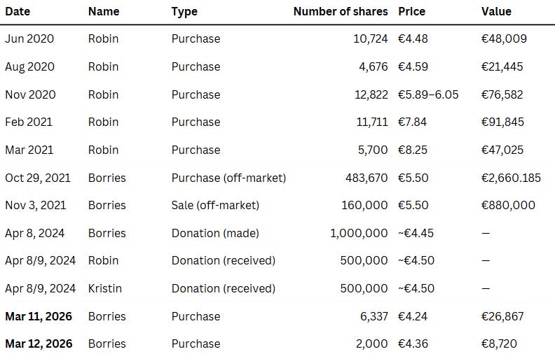 In April 2024, Borries donated most of his personal shareholding to his two children as part of a family succession plan. His personal stake dropped from over 25% to under 6%.