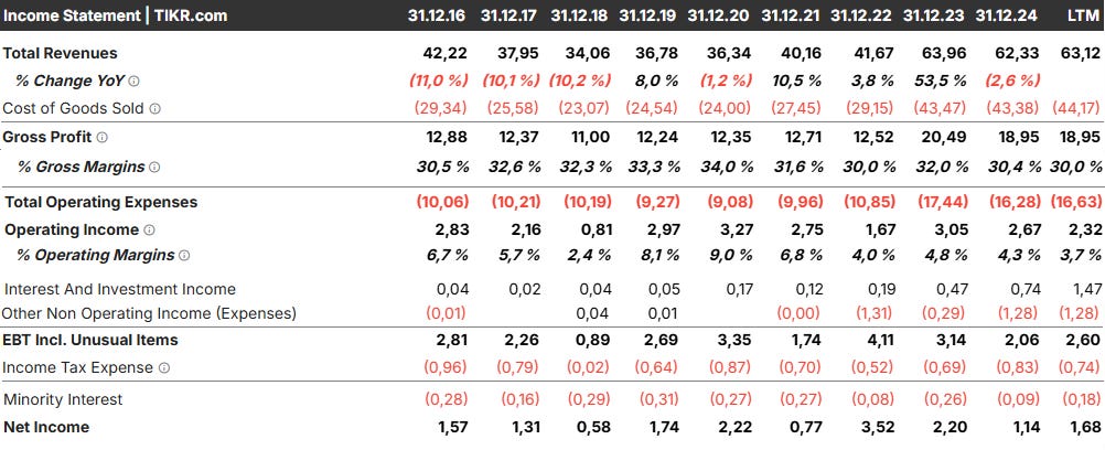 Operating margin has compressed from 7-9%, to 4.4% in 2024, and just 1.9% in H1 2025.