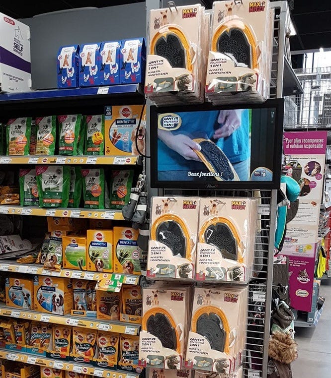 They place video screens directly inside French retail chains like Carrefour, Leclerc, and Castorama. The screens play short product demos. A shopper walks by, sees the product in action, and buys it right off the shelf.