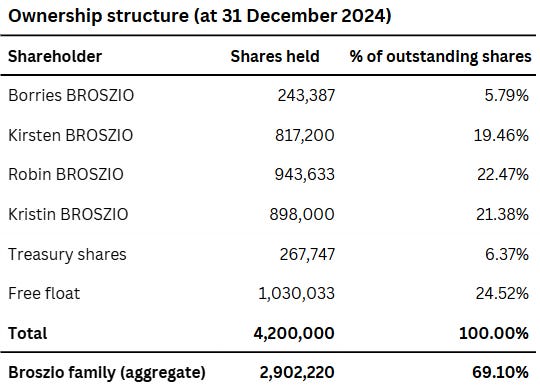 Fourth, there’s no real catalyst. The Broszio family controls 76% of the votes, which makes an activist campaign near impossible. The 2024 succession transfer, where the founder passed most of his shares to his two children, signals multi-decade continuity, not an exit event.