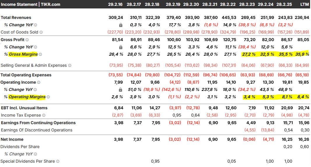 Revenue has come down from the 2020–2022 highs, but profitability has improved dramatically. Gross margins have expanded since 2023, reflecting the company’s sharper focus on its core tool and accessories business.
