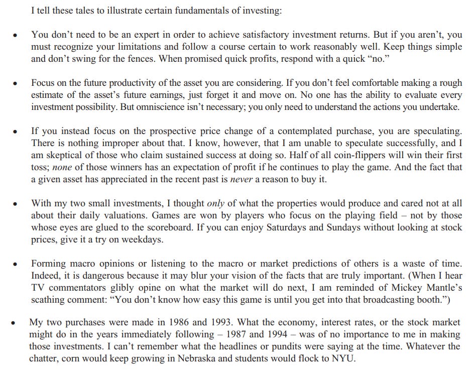 He talked about two simple real estate investments he made with his own (non-Berkshire) money. One was a small farm he bought in 1986. The other, a New York rental property in 1993. Both turned out to be great successes.