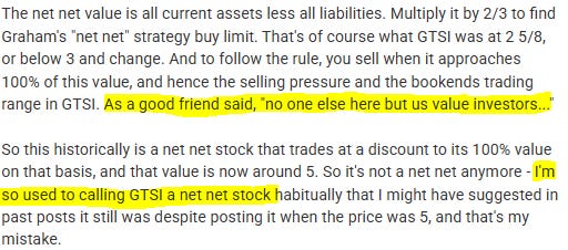 In the VIC comments, he explained that this was why he still thought of GTSI as a net-net. Even though it no longer qualified as one at the time of his write-up, he kept using the label out of habit.