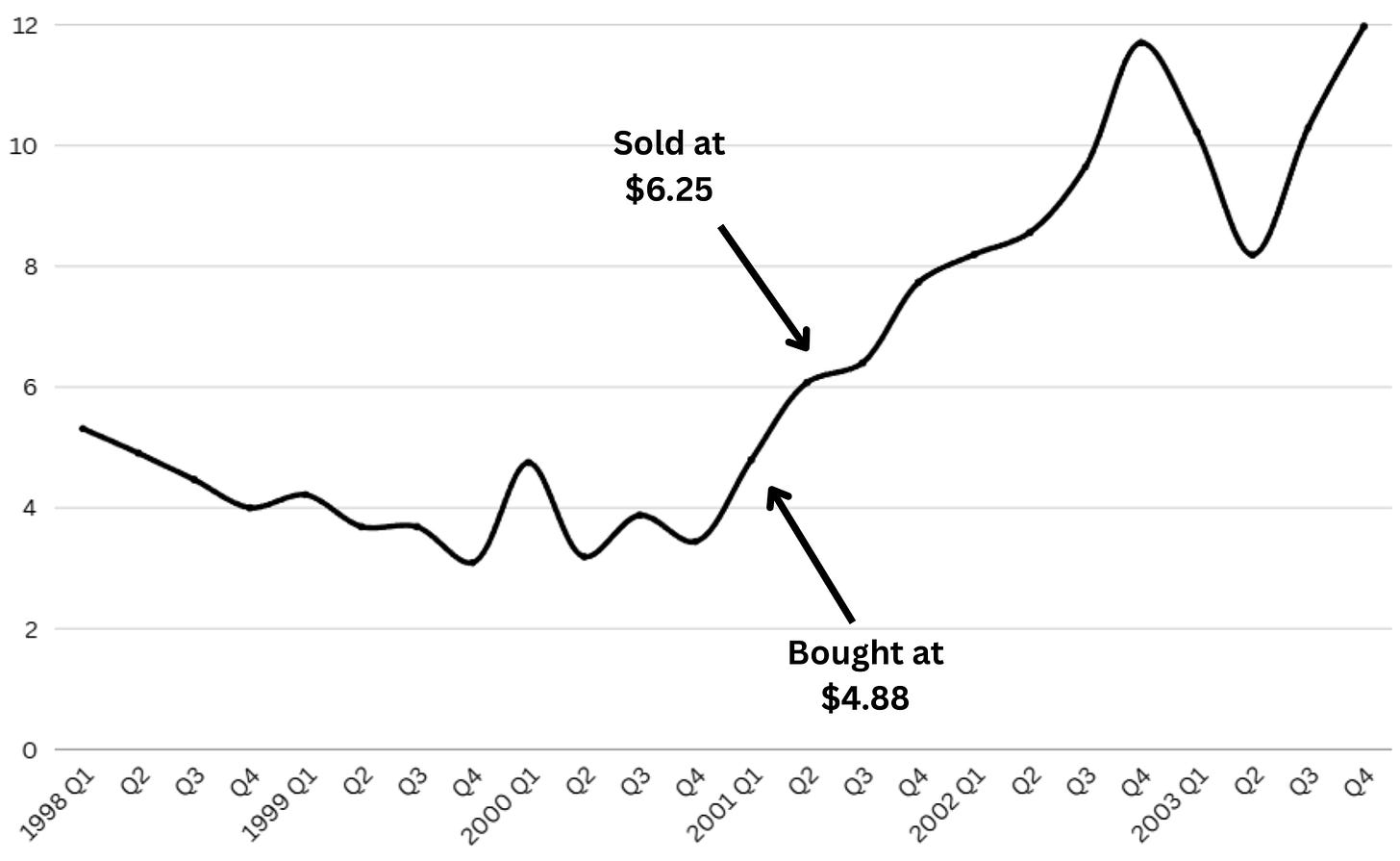 Even though this was a relatively small trade for him, with a total position size of just about $10,000 (if we only look at the 2001 purchases), it still says a lot about his qualities as a stock picker and how deep his understanding of valuation and market behavior really was.