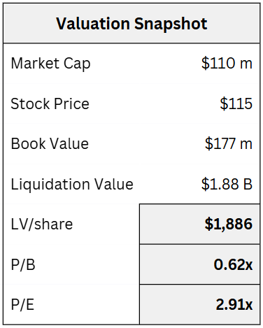 It was a small, illiquid company with a market cap of about $110 million and a book value of $177 million. So it traded at a modest discount to book value and at about 3 times earnings.