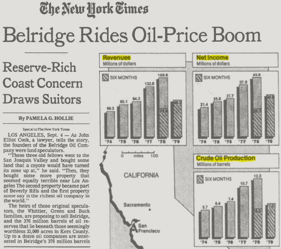 Belridge Oil was a small pink-sheet company that owned rich oil fields in California. It was founded in 1911 by the Green, Whittier, and Buck families, whose descendants still held majority control decades later.