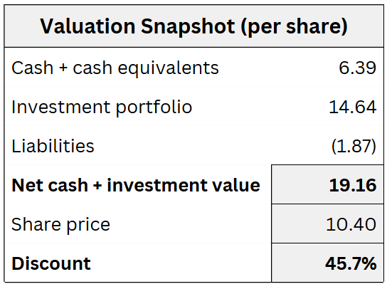 In other words, the market is valuing the company’s portfolio and net cash at only about 54 cents on the dollar. And the profitable operating business comes on top, for free.