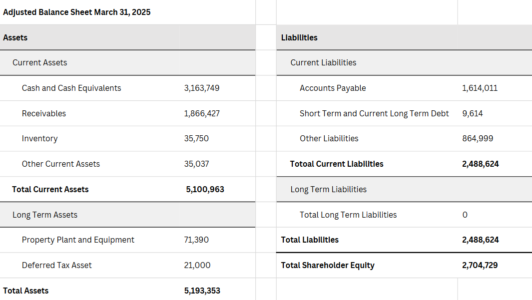 Subtracting all liabilities leaves an absolute net cash balance of $675,125.