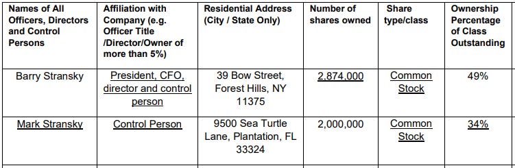 Ownership is very concentrated. CEO Barry Stransky owns 49% of the common, while Mark Stransky owns another 34%. That leaves only about 20% as free float, or 1,211,862 shares.