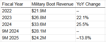 McRae already has an established and proven military boot production setup. If U.S. orders soften, like they did in 2025, foreign sales could help keep the factories running near full capacity.