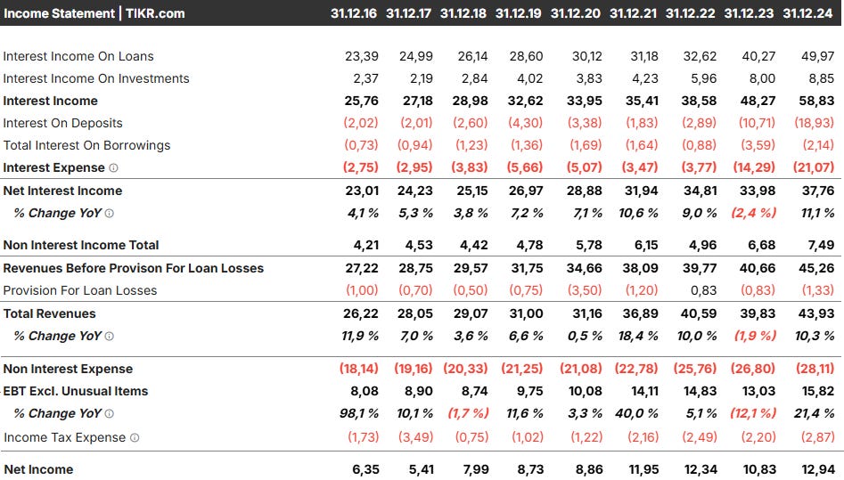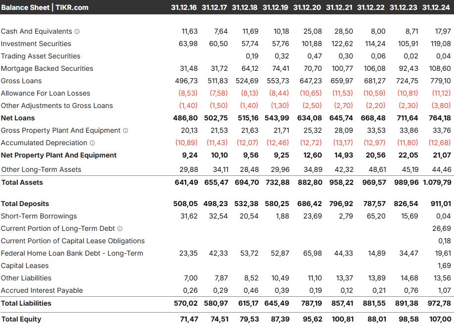 Over the past decade, net loans grew at a CAGR of 5.8%, while total deposits grew even faster at 7.4%. 2024 came in slightly above that average, continuing the long-term trend.
